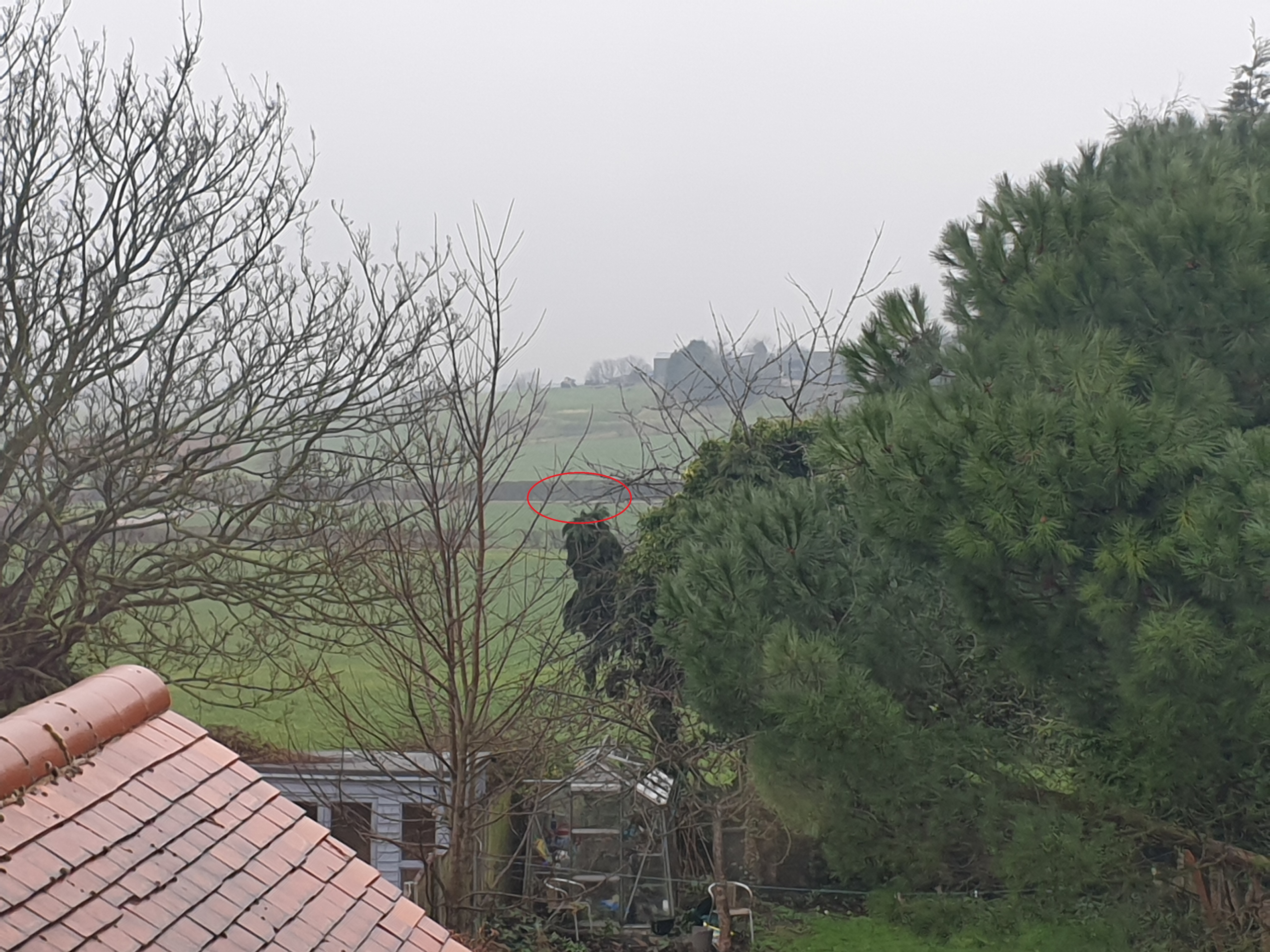 I ran downstairs and shouted and whistled and achieved nothing apart from raising my blood-pressure and probably annoying the neighbours. I dashed back to the bathroom and could see him heading up the hill towards the farm about where I’ve marked:
