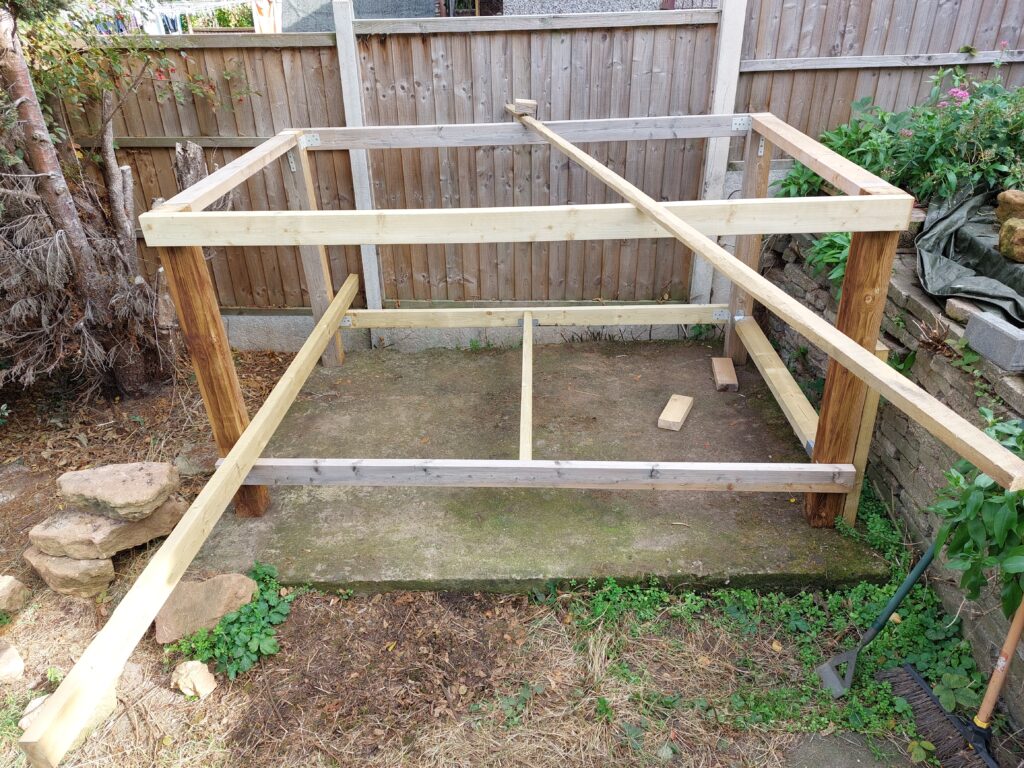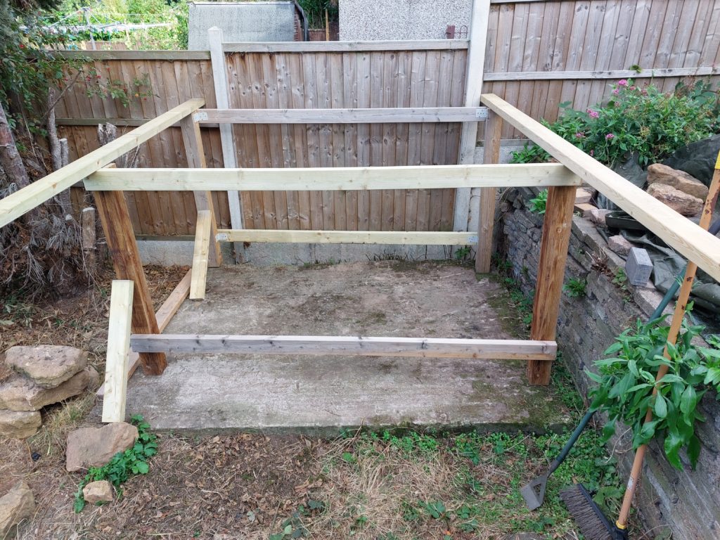 Then I fitted risers to the back upper support rail, to give the roof sufficient angle for water run-off. A wiser head would have built the back higher than the front to accommodate this requirement. Ahem.