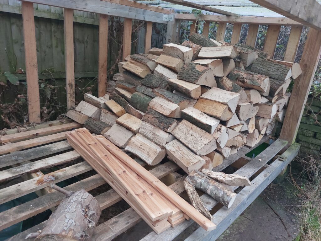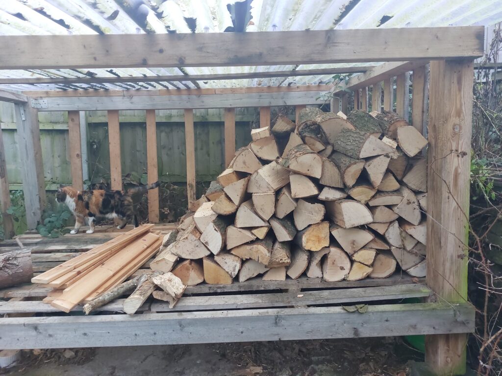 Well, it depends. Yesterday it was a mild day, temp hovered around 9c so I didn’t light the fire until 15.00 and we probably burned 4 logs. Days when the temp dips below 7c the fire is in all day and we’ll probably burn 10-11 logs. So that lot, temp fluctuation aside, will probably last 5-6 weeks