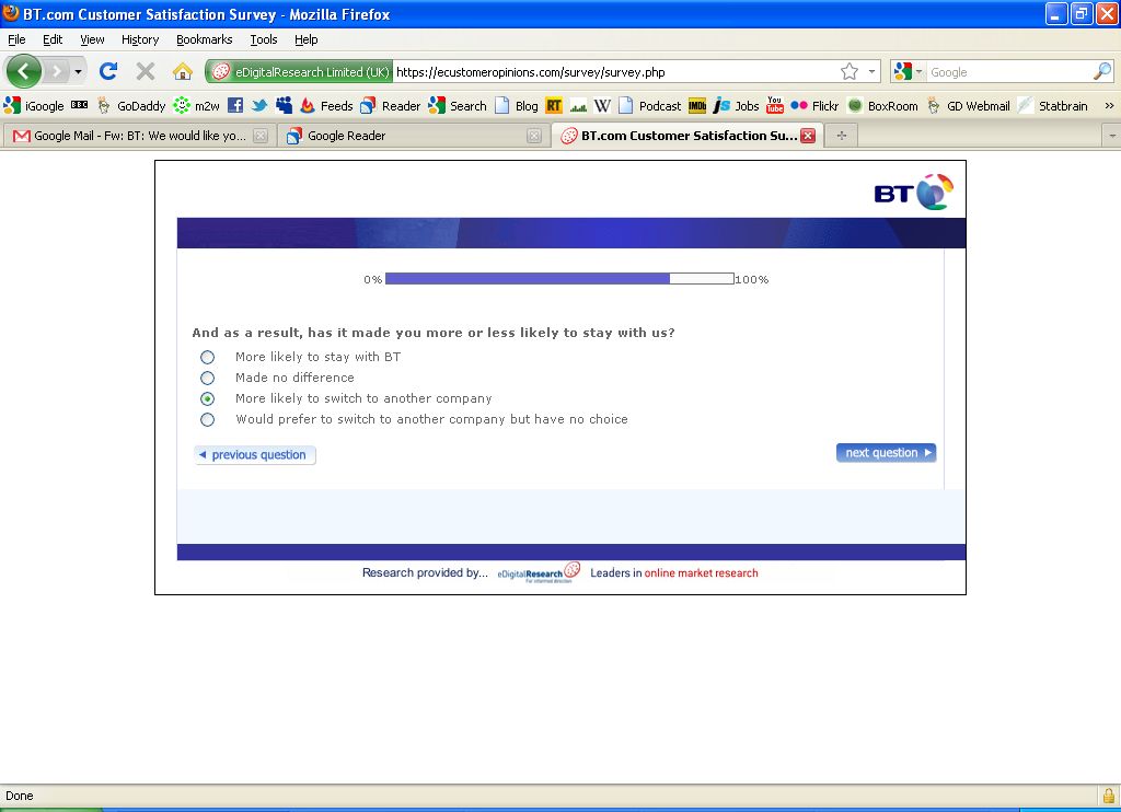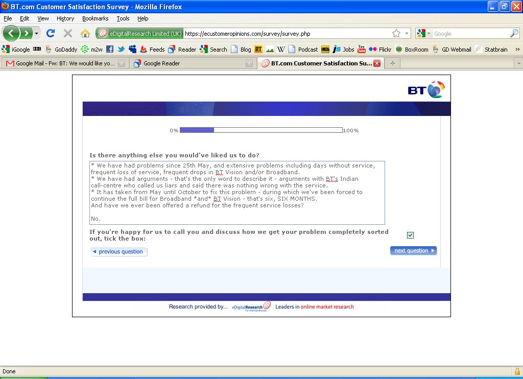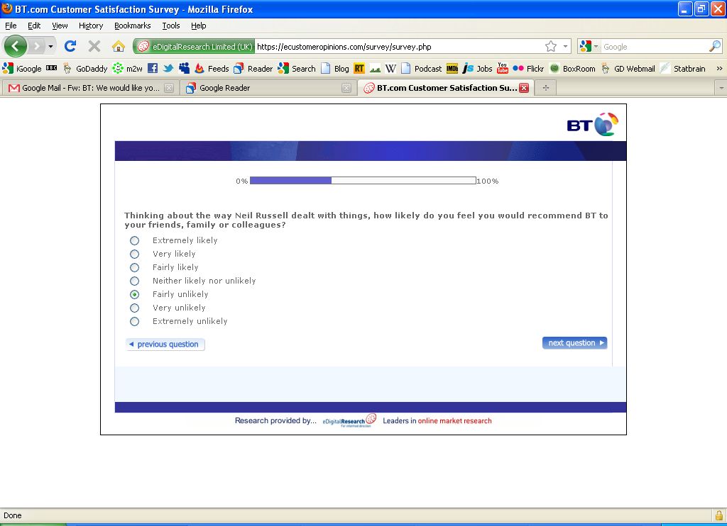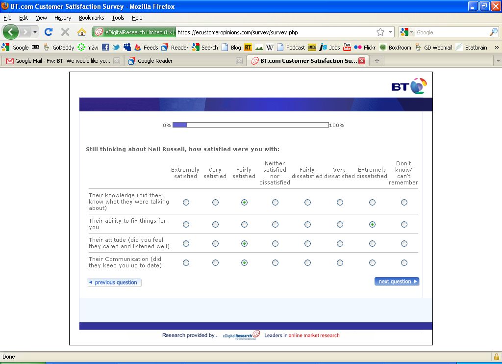 Not once does this questionnaire seek to differentiate the service levels that were delivered by BTs offshore call-centre, or the Tech Support people who I moved on to having dealings with in the last few months.